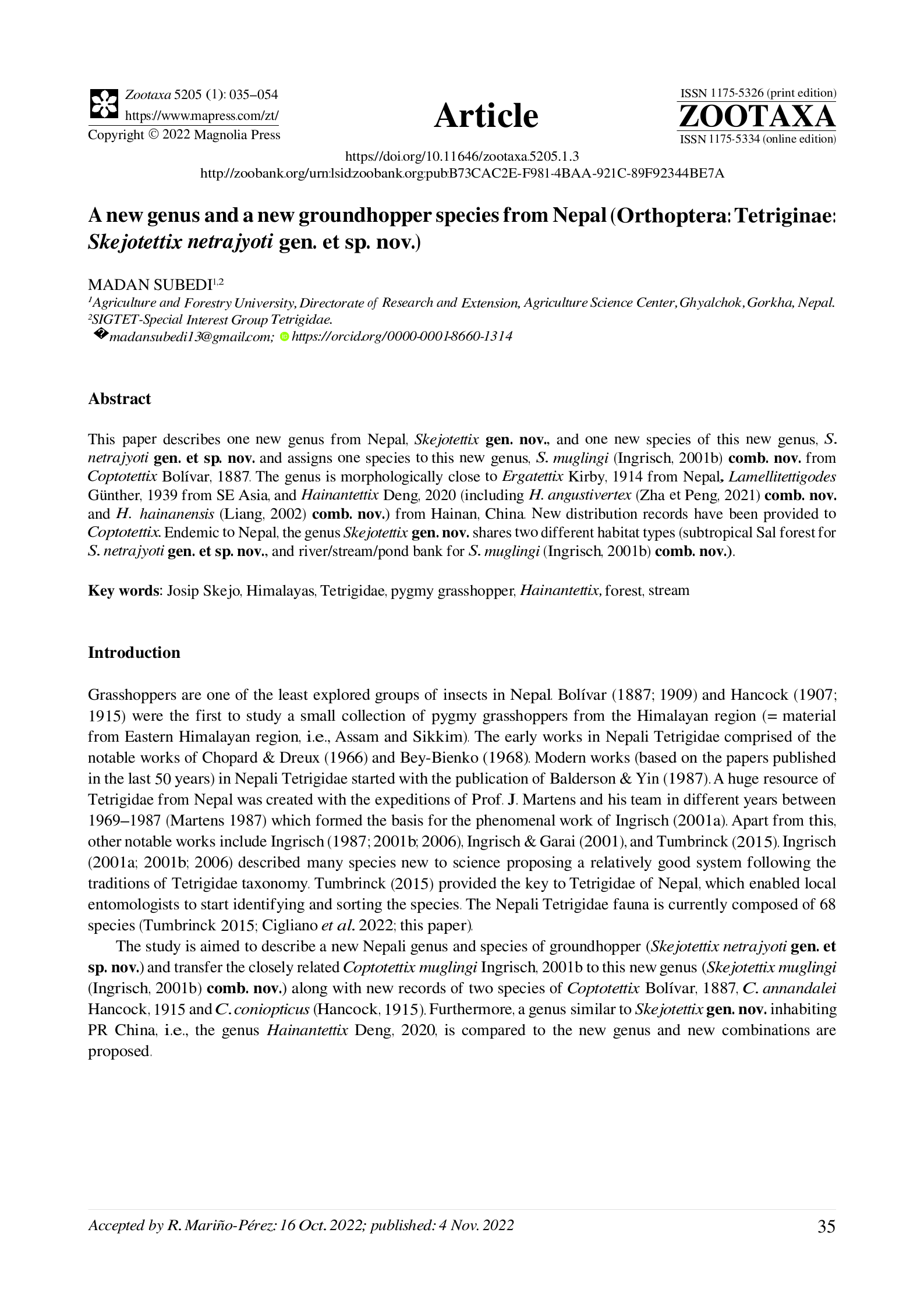 A new genus and a new groundhopper species from Nepal (Orthoptera: Tetriginae Skejotettix netrajyoti gen. et sp. nov.)
